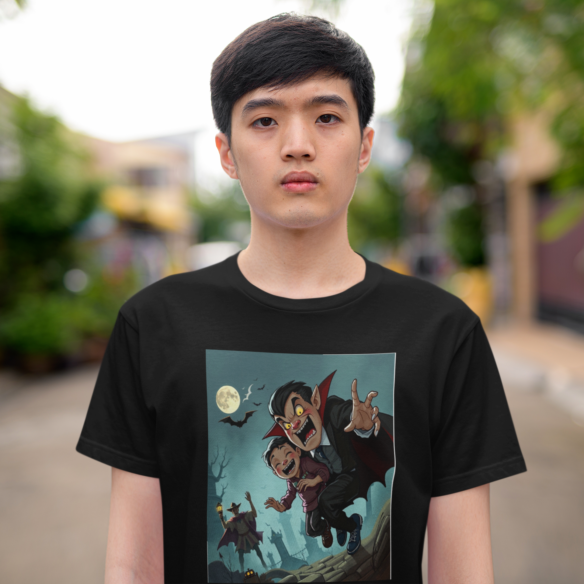 Elevate your Halloween wardrobe with our Custom Graphic T-Shirt featuring a playful cartoon character of Dracula & Son that adds a fun twist to your festive attire. Crafted from 100% soft cotton, this shirt ensures all-day comfort while being available in all adult sizes—just ask! Designed for durability, it is washing machine safe when turned inside out and washed on a cold, gentle cycle, ensuring the vibrant graphics last through many washes. Perfect for Halloween celebrations or casual outings, this t-shirt is a must-have for anyone looking to showcase their playful side.