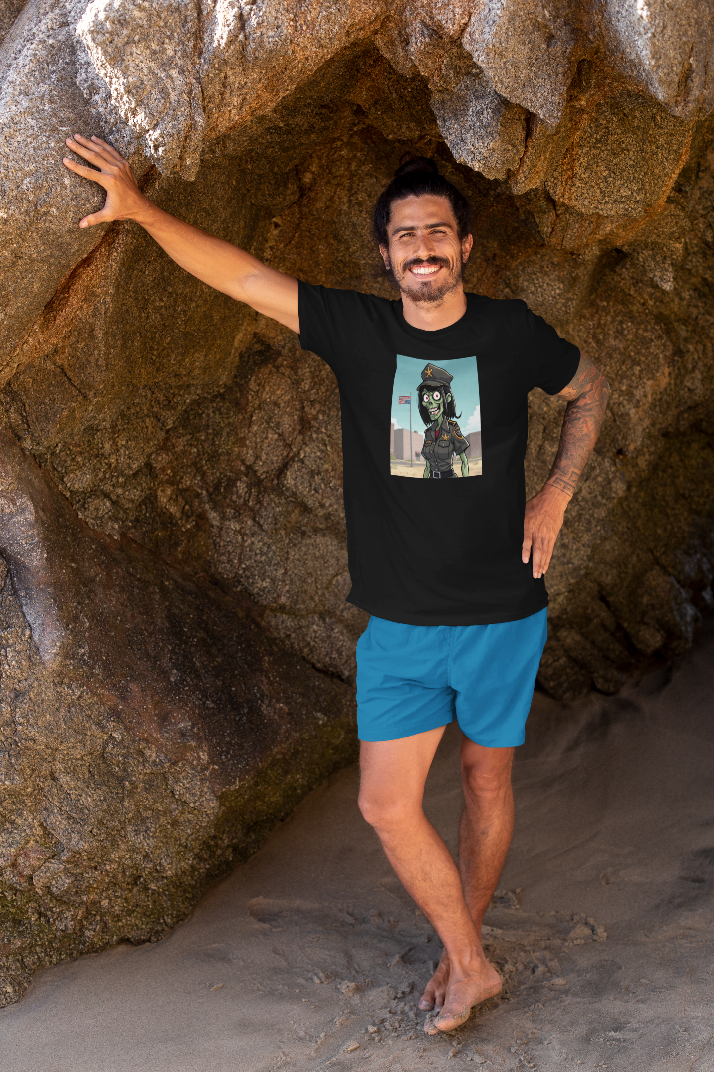Introducing our Custom Graphic T-Shirt featuring a playful cartoon Kristi zombie in Homeland security uniform, perfect for adding a touch of fun to your Halloween wardrobe. Crafted from 100% soft cotton, this shirt ensures comfort while making a bold statement. Available in all adult sizes, simply ask for your preferred fit. Designed for easy care, this shirt is washing machine safe—just turn it inside out, wash on a cold, gentle cycle, and tumble dry on low heat to keep the vibrant graphics looking fresh after many washes. Embrace the spirit of Halloween with this unique and durable t-shirt that combines style and practicality